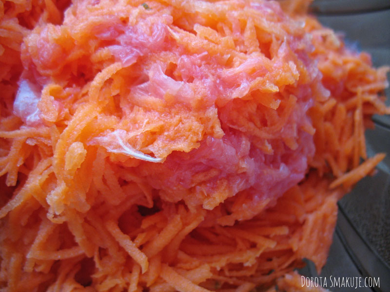 Zarówno marchewkę jak i grejpfruta przepuściłam przez maszynę do szatkowania, doprawiłam olejem i cukrem do smaku.