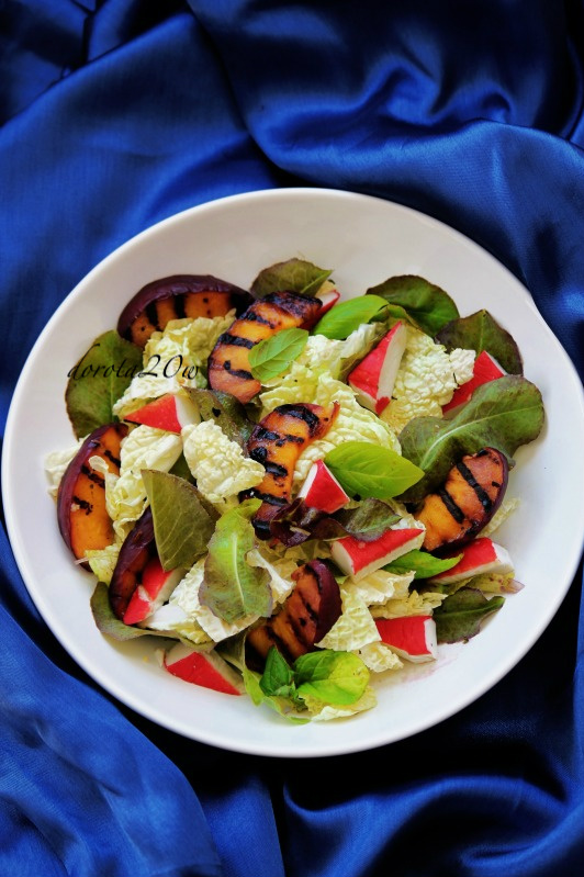 Wersja zimowa to sałata lodowa plus surimi plus brzoskwinie z