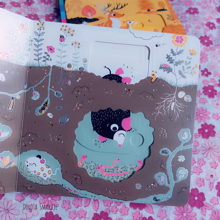 Książeczka „Pod ziemią” pokazuje maluszkom zwierzęta żyjące pod ziemią. Poznajemy ich domki oraz zwyczaje. Widzimy, jak bawią się myszki i króliczki, jak mrówki kopią tunele, a małe borsuki śpią słodko w norkach.
