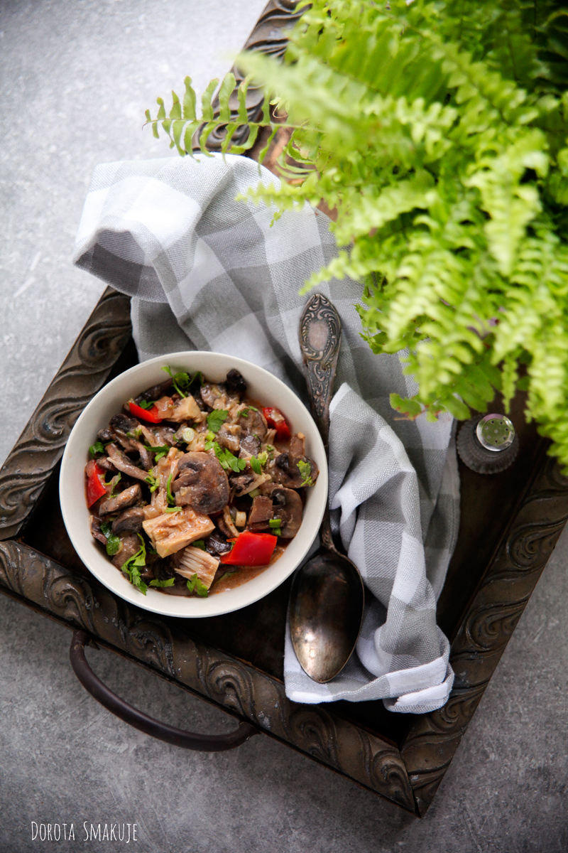 Strogonow z pieczarkami, jackfruitem, papryką marynowaną czyli po prostu strogonow wegetariański.
