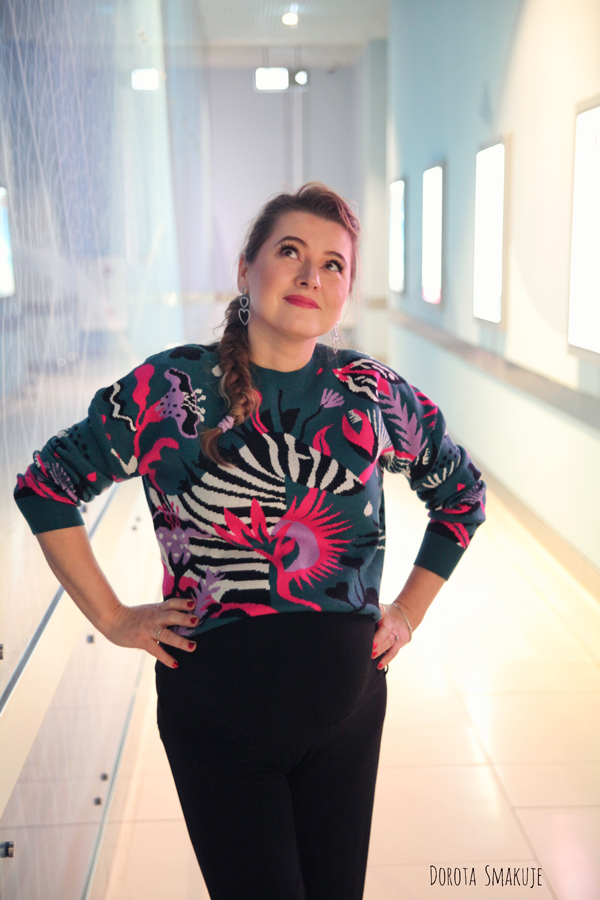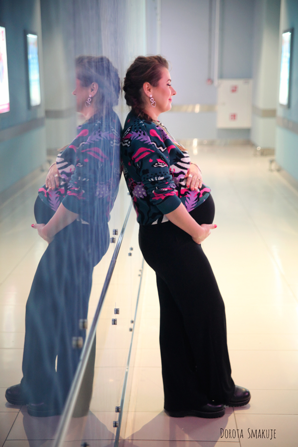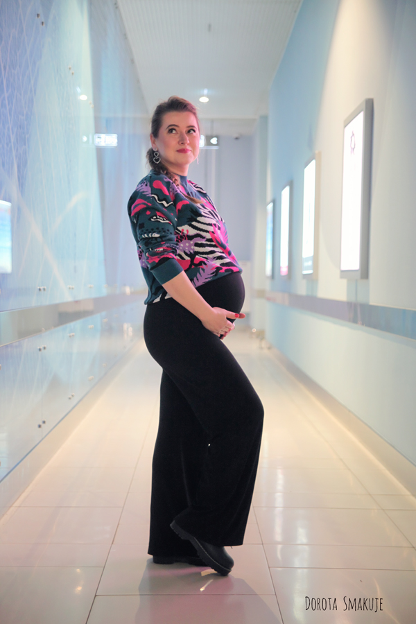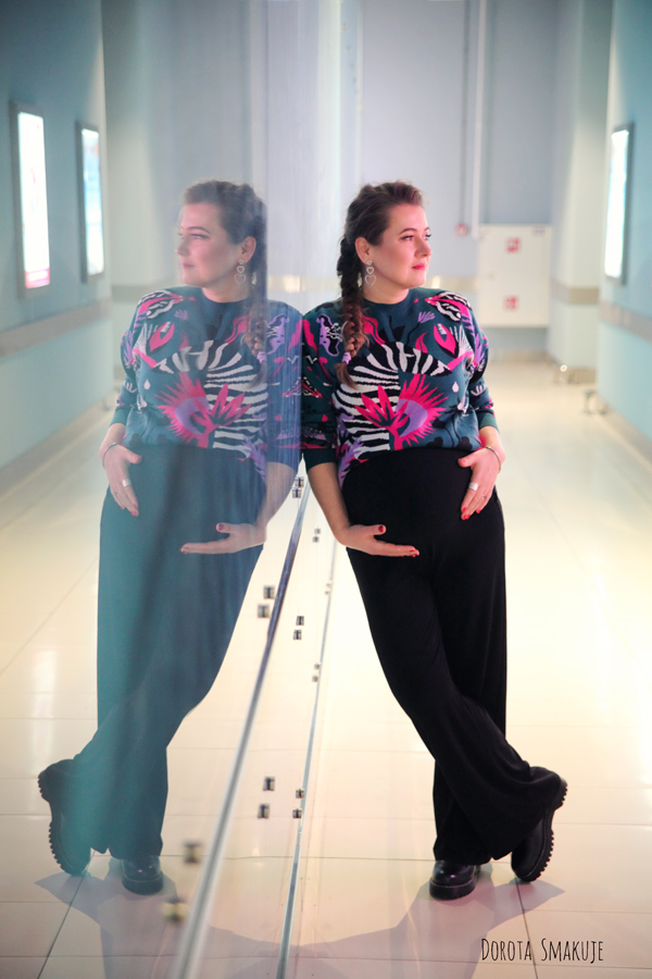 Jeśli mamy element stroju, który robi robotę – jak ten piękny sweter, to warto pozostałe elementy stylizacji uczynić dla niego tłem. Ja dobrałam eleganckie spodnie ciążowe z lejącej wiskozy z prostymi nogawkami oraz czarne, skórzane workery.
