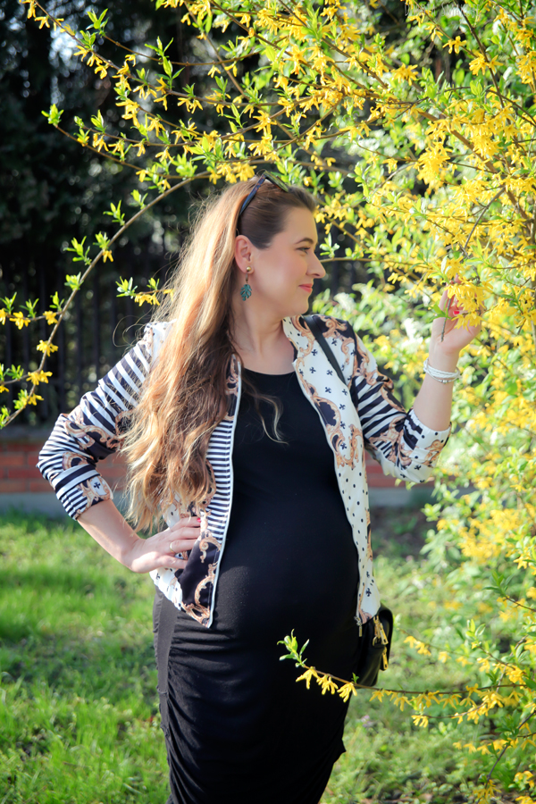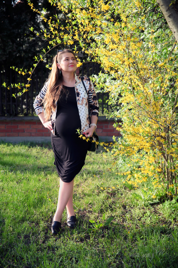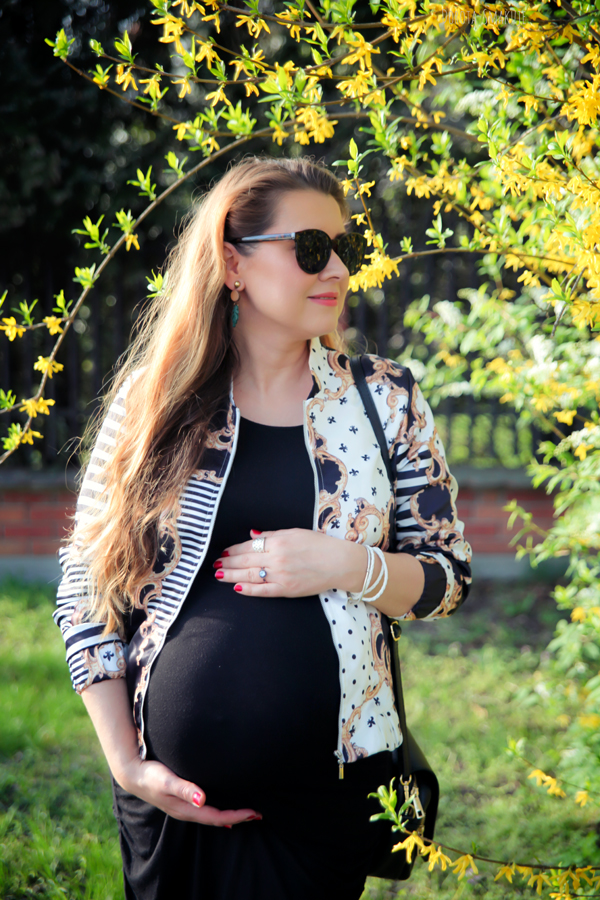 Ja tym razem stylizowałam moją ciążową sukienkę czarną na eleganckie wyjście, ale półformalne i właśnie ta cienka bomberka bardzo mi się sprawdziła. Do tego buty brzydale czyli mokasyny na grubym obcasie, jednak cały czas obcasie i biżuteria.