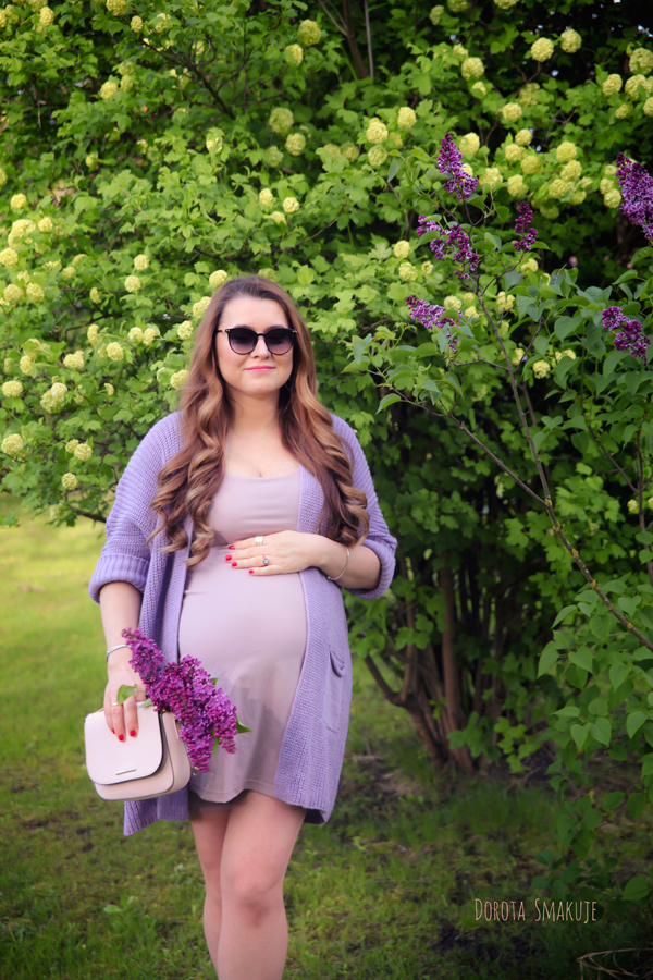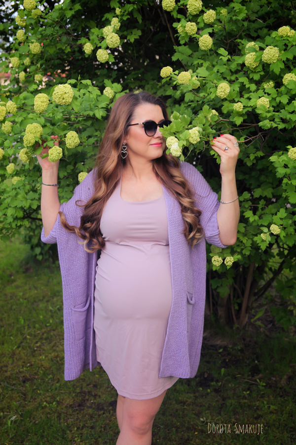 Lawendowa sukienka ciążowa w długości mini, na szerokich ramiączkach i z kwadratowym, dość głęboko wyciętym dekoltem.