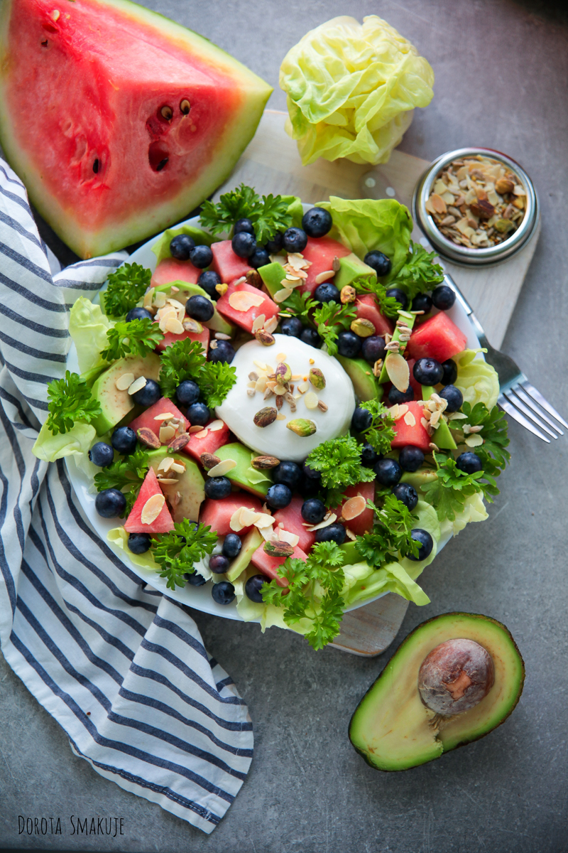 Arbuza kroimy w dużą kostkę i rozkładamy na sałacie.