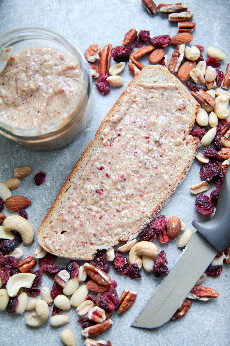 Dużo więc przy naszej 7 osobowej rodzinie schodzi tego masła. Mamy swoje ulubione pasty orzechowe kupne, ale sami tez lubimy je robić, bo można tu poeksperymentować ze smakami. Dzisiaj wersja z dodatkiem suszonej żurawiny. Zacna wyszła i warta wypróbowania. Polecam!