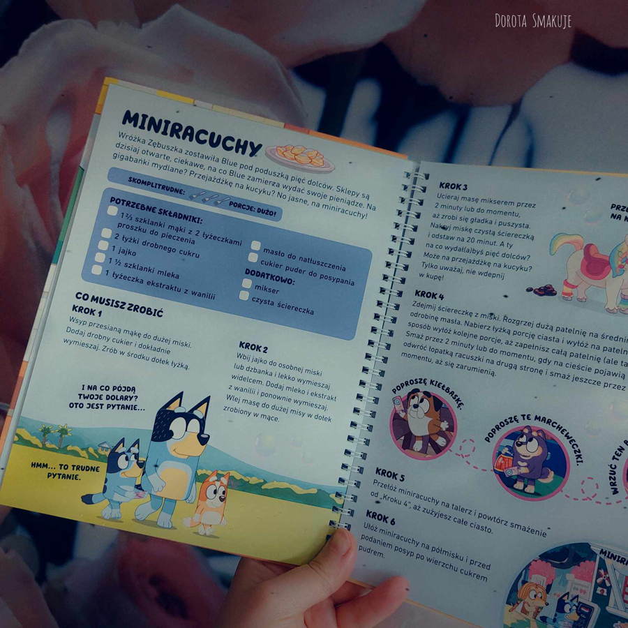 Przepisy są krótkie, przejrzyste i zrozumiałe, a do tego podzielone na łatwe do ukończenia etapy, dzięki czemu wspólne gotowanie przyniesie dużo satysfakcji zarówno dzieciom, jak i asystującym im dorosłym. Przy każdym przepisie podano również stopień trudności (a raczej „skomplitrudności”) potrawy, dzięki czemu łatwiej zorientować się w skali kulinarnego wyzwania. Są tu także proste listy składników i niezbędnych akcesoriów oraz strona, na której można zaplanować menu na cały tydzień. Zabawny język książki, ilustracje zaczerpnięte wprost z serialu i uroczy klimat serialu Bluey sprawią, że „Książka kucharska Wytwornej Restauracji” zachęci maluchy nie tylko do pierwszych przygód w kuchni, ale i do próbowania nowych potraw i smaków. Praktyczna oprawa ze spiralą, dobrej jakości gruby papier i niezniszczalna, odporna na kuchenne eksperymenty okładka sprawią, że książka posłuży przez długi czas. Doskonale nadaje się również na prezent, zarówno dla smakoszy, jak i dla niejadków!