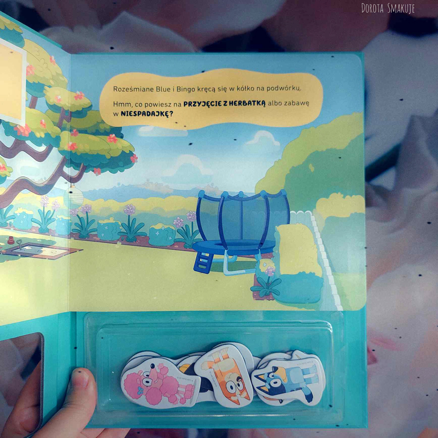 Książka z 12 magnesami Blue i Bingo to sposób na niekończącą się zabawę w pojedynkę lub w towarzystwie przyjaciół i rodziny! Na każdej stronie książki na malucha czeka pusta scenka z serialu Bluey, którą można uzupełnić uroczymi magnesami. Jest tu podwórko rodziny Łączków i uliczka, przy której Blue i Bingo otwierają swój sklepik, a także las i szkolne boisko. W każdym z tych miejsc można układać magnesy tak, by bohaterowie kreskówki bawili się w swe ulubione zabawy albo w inne, wymyślone przez dziecko. Stworzone w ten sposób scenki można sfotografować na pamiątkę, a potem zacząć zabawę od nowa.