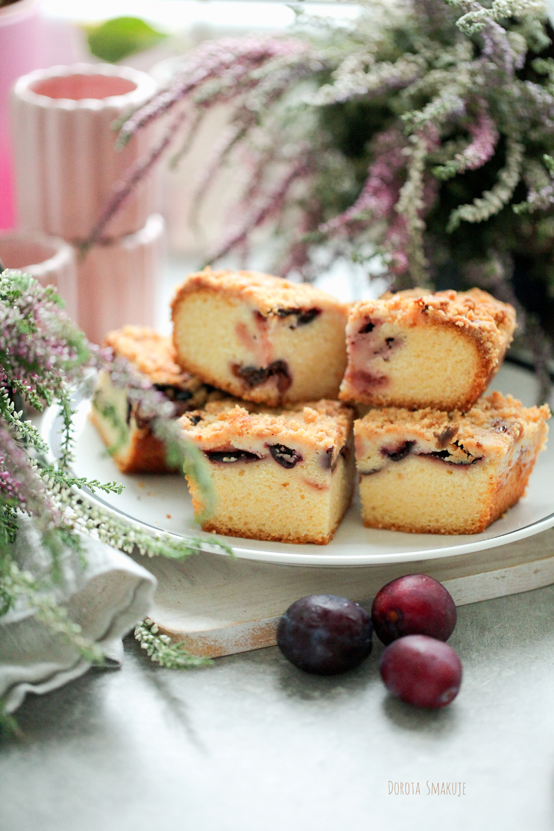 Na wierzchu układamy połówki śliwek i posypujemy kruszonką.
