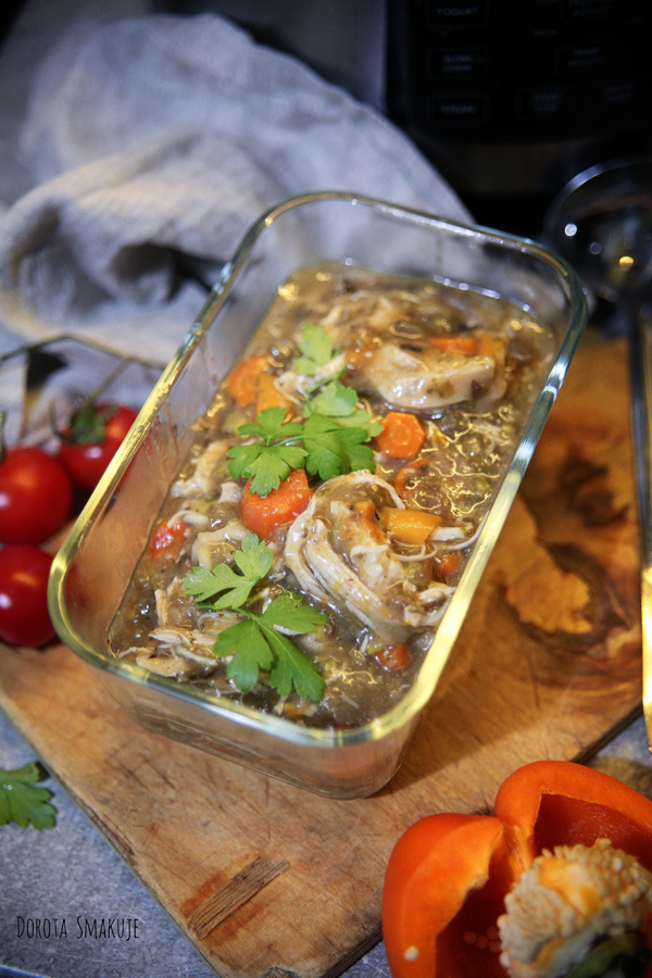 Do garnka szybkowaru wkładamy pierś kurczaka – jeśli używacie mrożonej – wkładamy zamrożoną.