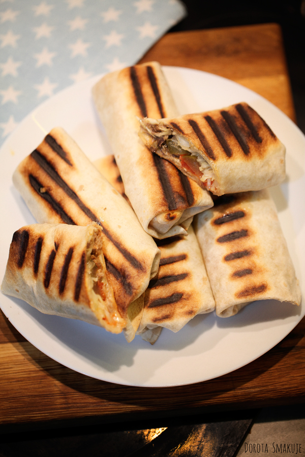 Wrapy układamy na suchej patelni lub na grillu elektrycznym i chwilę zapiekamy.