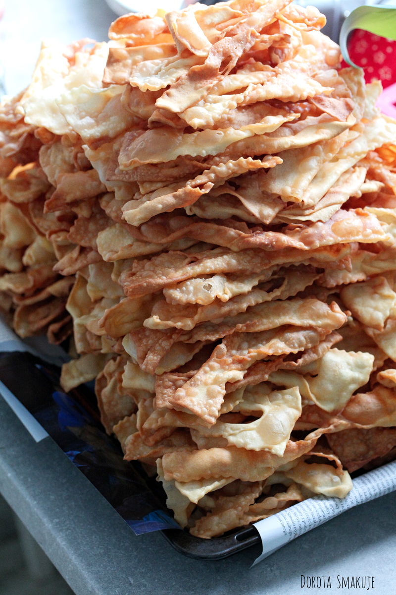 - W końcu faworki smażymy krótko w rozgrzanym smalcu na złoto z obu stron, przekładamy na talerz wyłożony starą gazetą.