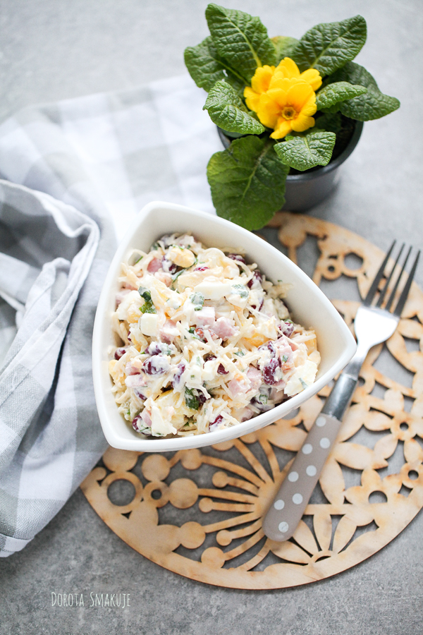 Sałatka z jajkiem, szynką i serem żółtym to prawdziwy hit każdej imprezy i świątecznego stołu.