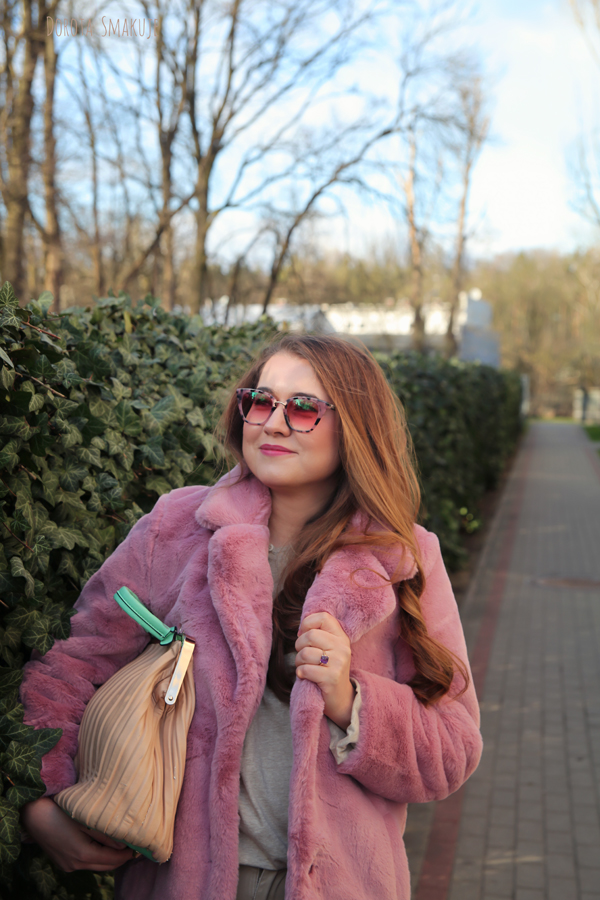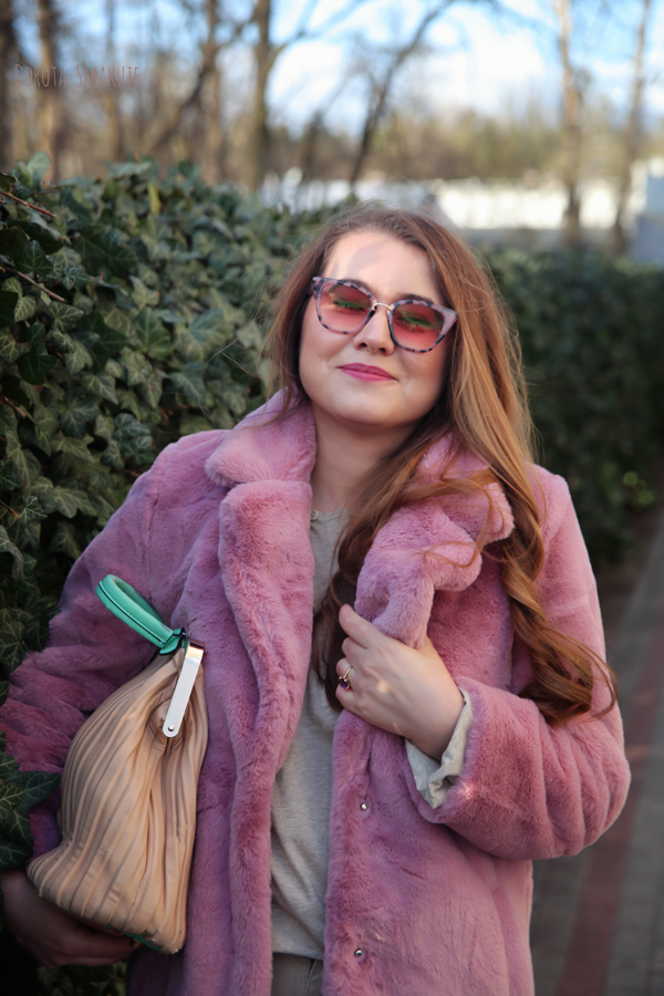 Jednak wczoraj pogoda zaskoczyła nas mrozem i śniegiem, co dało mi doskonałą okazję do wyciągnięcia z szafy mojego ulubionego różowego futra. W tym sezonie futra są bardzo modne.