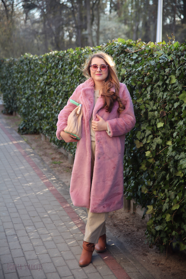 Do futra dobrałam beżowe bojówki z modnymi teraz szerokimi nogawkami. Ich luźny krój zapewnia komfort i swobodę ruchów, a neutralny kolor doskonale komponuje się z różem futra.