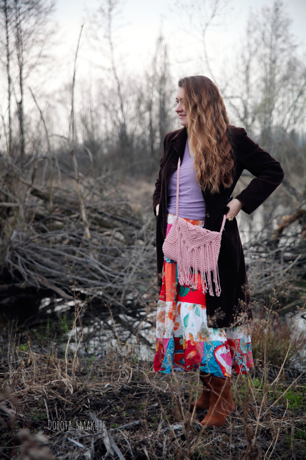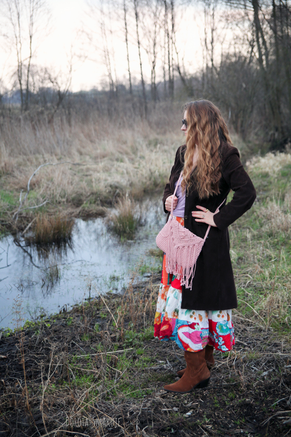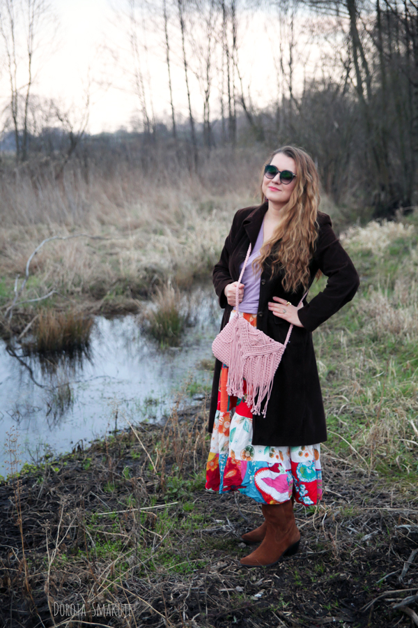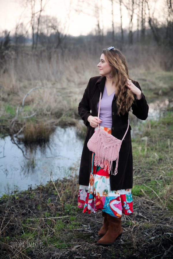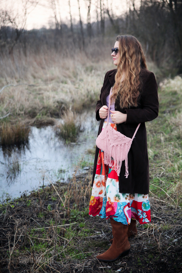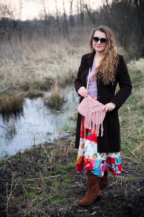 Na chłodniejsze dni wybrałam brązowy sztruksowy płaszcz sięgający do połowy łydki. Sztruks to materiał, który natychmiast przywołuje klimat lat 70. – złotej ery stylu boho. Czekoladowo brązowy odcień jest teraz bardzo modny oraz dodaje stylizacji elegancji. Długość płaszcza tworzy interesującą proporcję z pozostałymi elementami stroju.