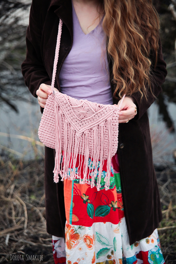 Sercem dzisiejszej kompozycji jest jasnoróżowa makramowa torebka wykonana ze sznurka. To ona zainspirowała mnie do stworzenia całej stylizacji! Makrama, jako technika rękodzielnicza, doskonale oddaje filozofię boho – każdy splot opowiada historię, każdy detal jest niepowtarzalny. Pastelowy róż torebki wprowadza subtelny akcent kolorystyczny, który przełamuje paletę.