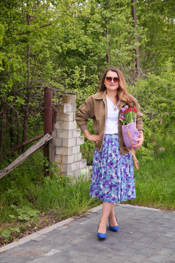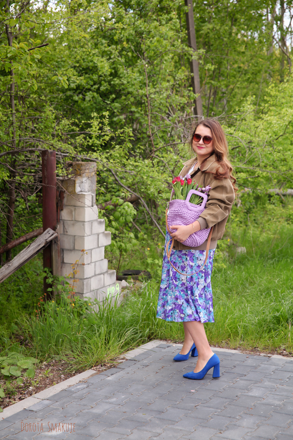 Na nogi wskoczyły chabrowe buty na obcasie, które idealnie korespondują z niebieskimi akcentami na spódnicy. Całość dopełnia lawendowa, pleciona torba-koszyk – mój absolutny must-have tego sezonu! Ten drobny akcent wprowadza do stylizacji wakacyjny vibe i sprawia, że całość jest jeszcze bardziej wiosenna.