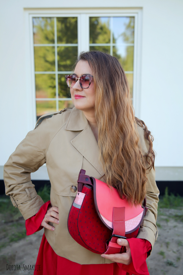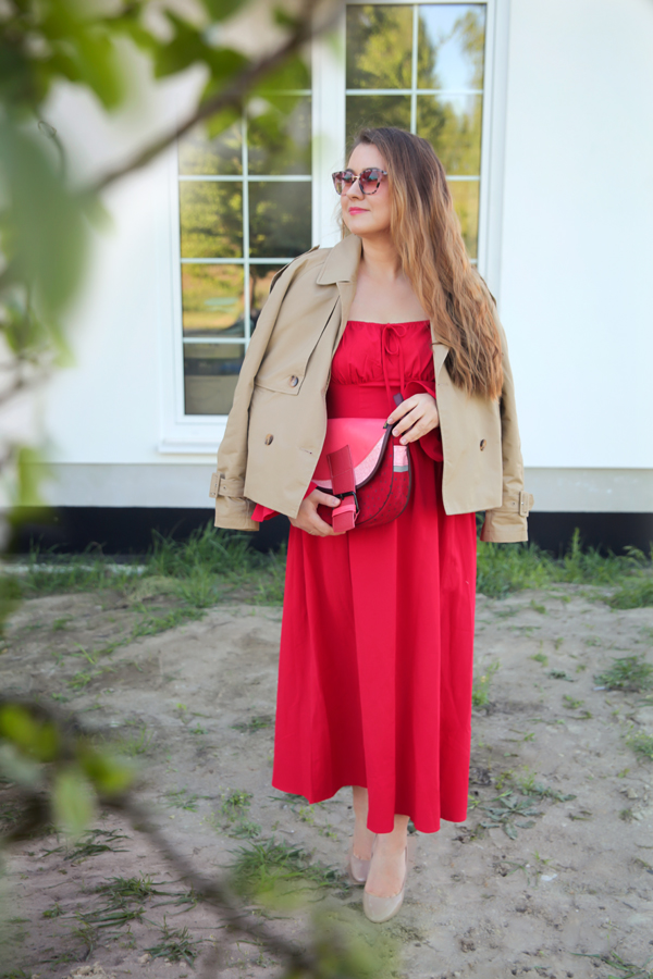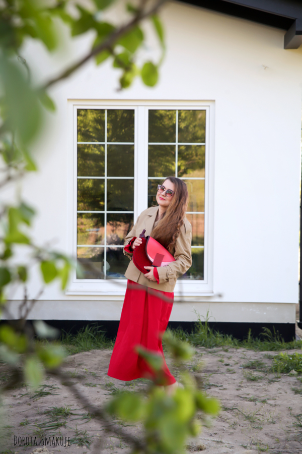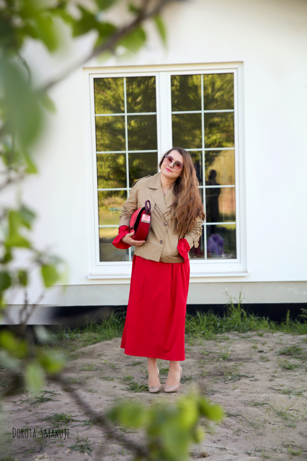 Dzisiejsza stylizacja to mój mały manifest kobiecości – rozkloszowana czerwona sukienka (idealna do spontanicznych tańców z dziećmi!), krótki beżowy trencz na wiosenne chłody i szpilki, które dodają nie tylko centymetrów, ale i pewności siebie.
