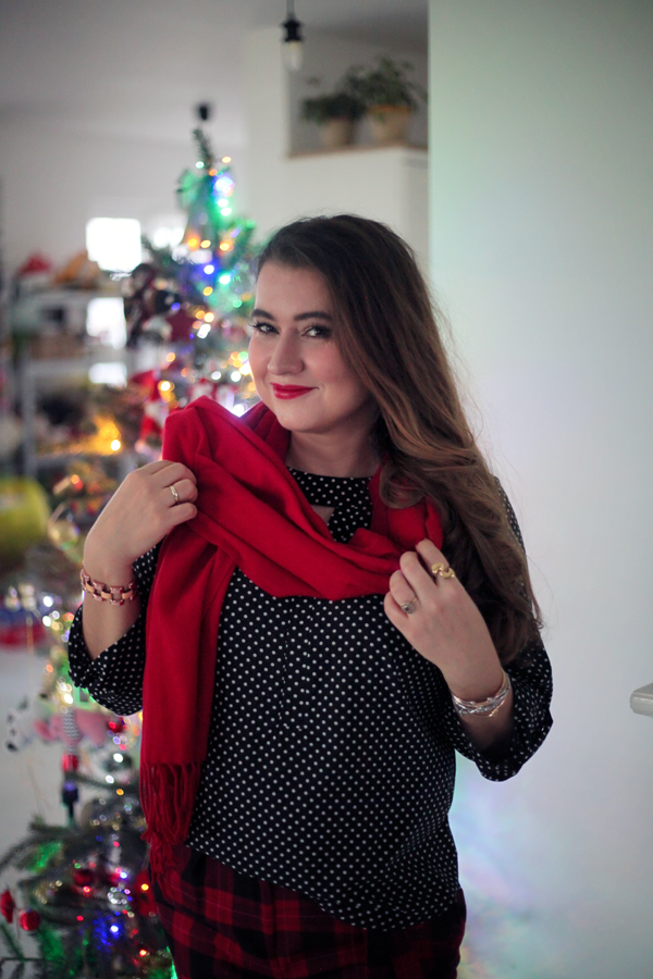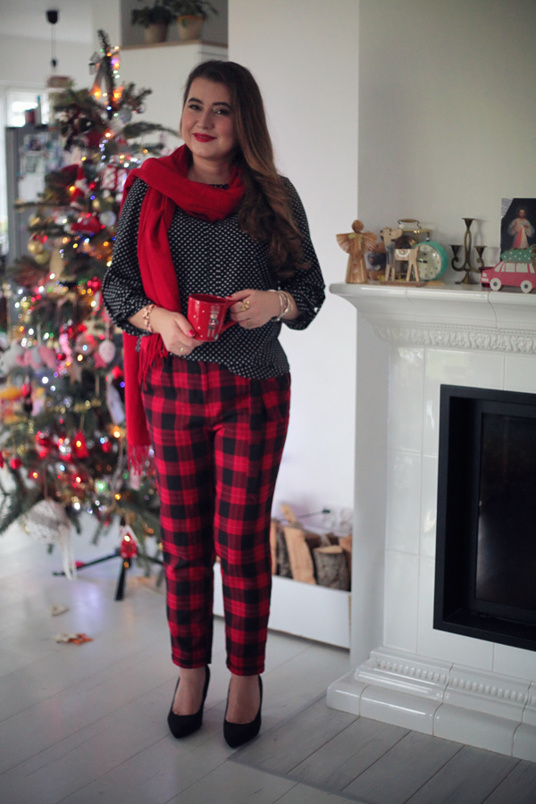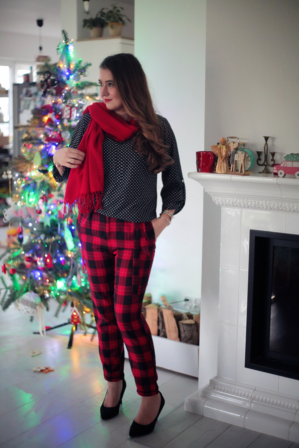Aby podkreślić świąteczny charakter stylizacji, dodałam intensywnie czerwony szalik, który idealnie komponuje się z kolorem spodni i wprowadza dodatkową dawkę ciepła – zarówno wizualnego, jak i dosłownego!