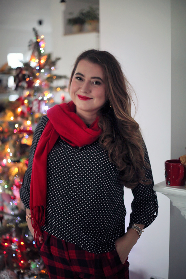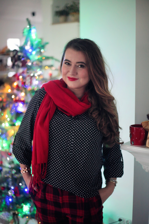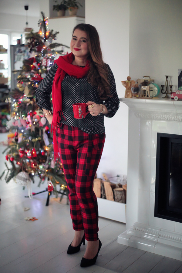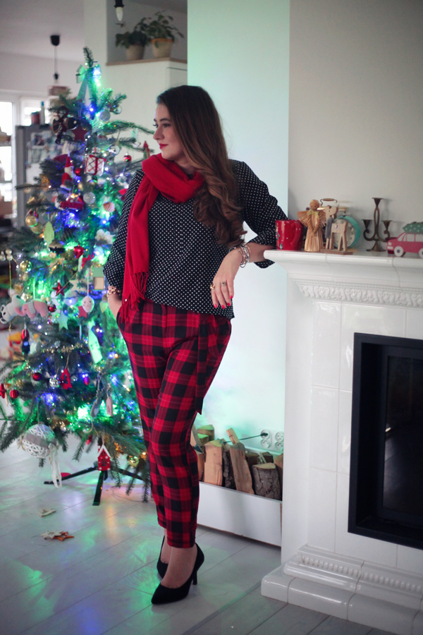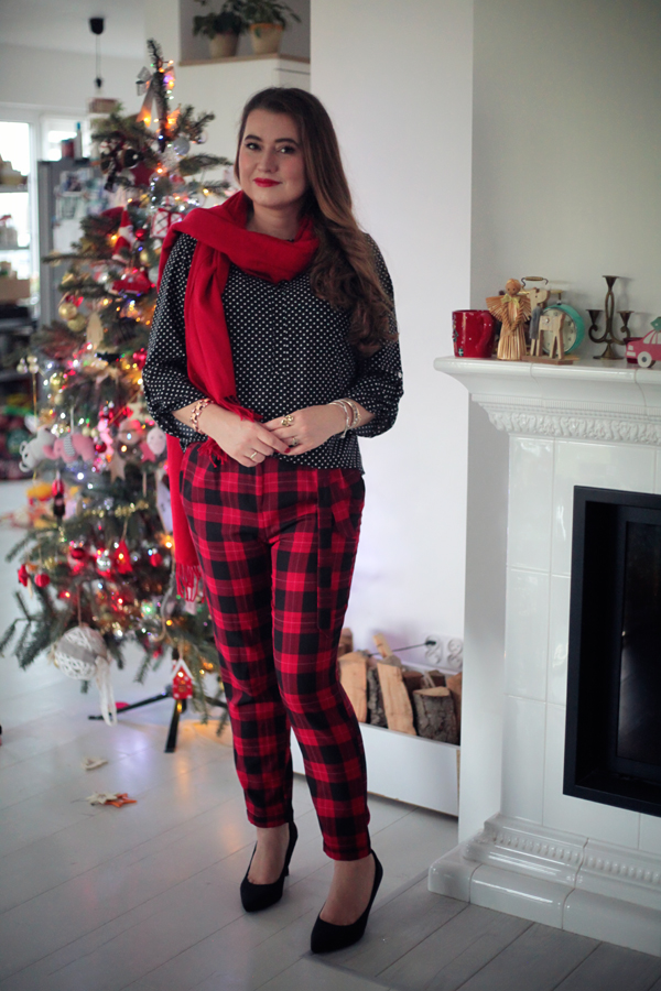 Na dzisiejsze przedświąteczne spotkanie zdecydowałam się na odważne połączenie klasyki z odrobiną szaleństwa. Podstawą mojej stylizacji jest elegancka czarna bluzka w białe kropki od polskiego producenta KasiaStyl. Uwielbiam wspierać rodzime marki!