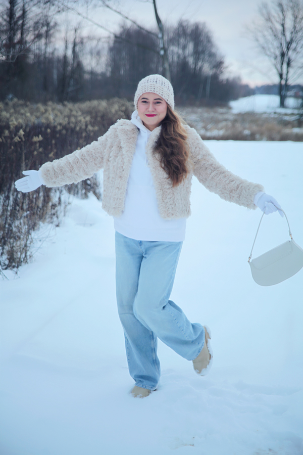 Krótkie jasne futerko – noszone na bluzie, dodaje stylizacji lekkości i odrobiny luksusu, a jasny kolor pięknie kontrastuje ze śniegiem.