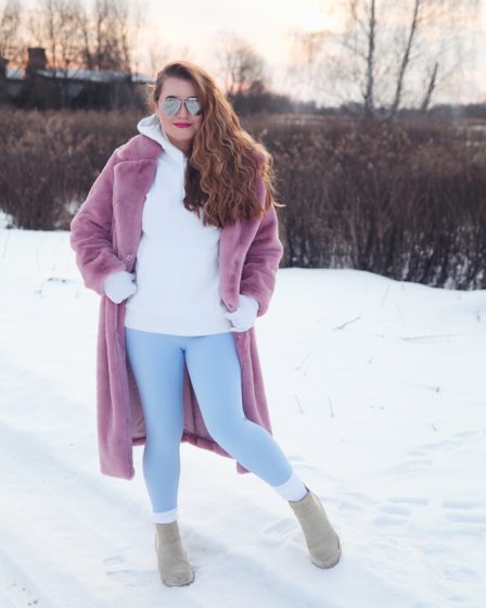 Trend alert: Ice blue legginsy i różowe futro