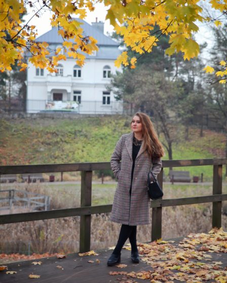 Stylizacja: płaszcz w pepitkę i torebka kuferek